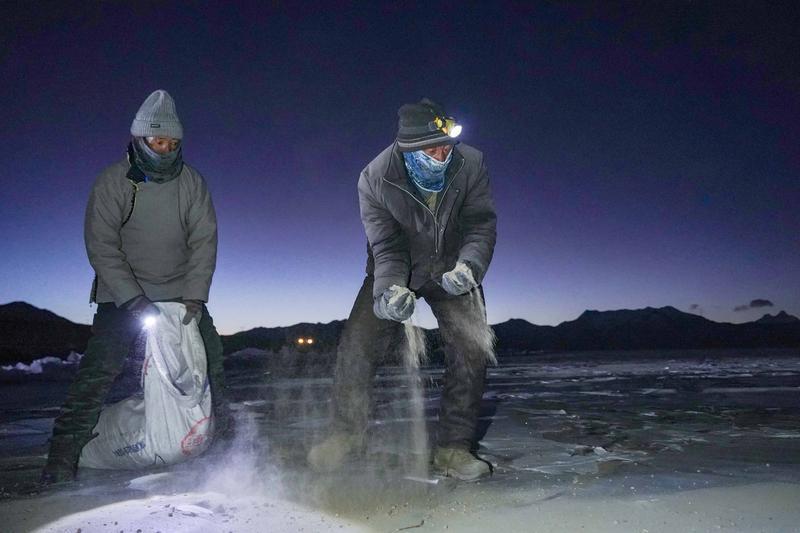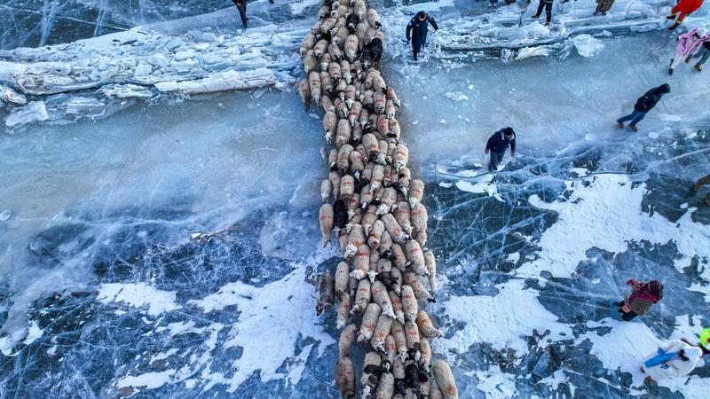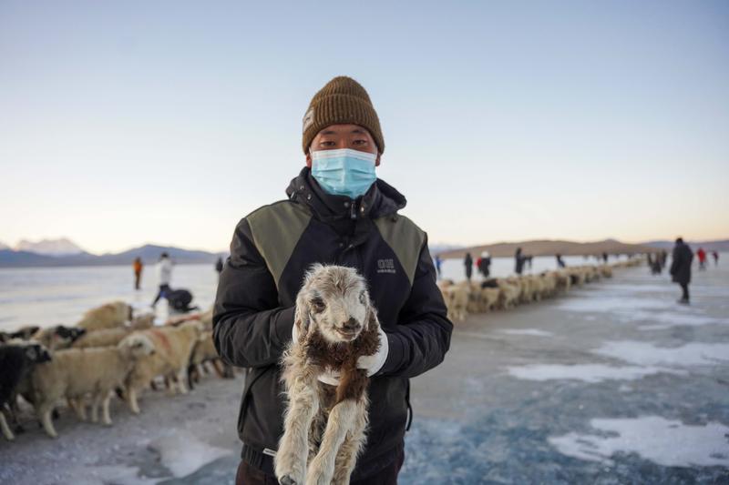 早上8点左右,赶羊正式开始。几名牧羊人先行一步在冰面撒上炉灰,一名牧羊人抱着小羊踏上冰面,身后是羊群在冰湖上缓慢前行。还有两名牧羊人牵着牧羊犬,与其他牧羊人一起分列两侧,维持秩序。