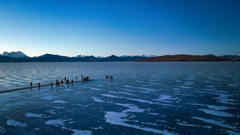 推瓦村位于山南市浪卡子县打隆镇,海拔超过5000米,是世界海拔最高行政村之一,这个遗世独立的小村庄,就坐落在风景绝美的普莫雍措湖畔。普莫雍措被誉为“仙女之泪”“中国的贝加尔湖”,每年冬季,湖面结冰,冰面通透可见湖底,在阳光的照射下,呈现出动人心魄的蓝冰。而此时,也是推瓦村羊群转场的最佳时节。