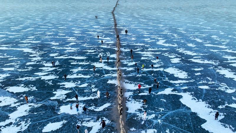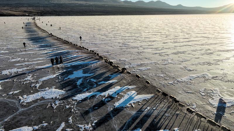 去往湖心岛的路程大约3公里,走在冰面上,偶尔响起的冰层破裂声还是让人不由得心惊。此刻,几百只羊宛如一条长长的直线,在牧羊人的指挥下缓慢前行。金色的太阳露出地平线,羊群的影子投射在蓝色的冰面上,美不胜收。