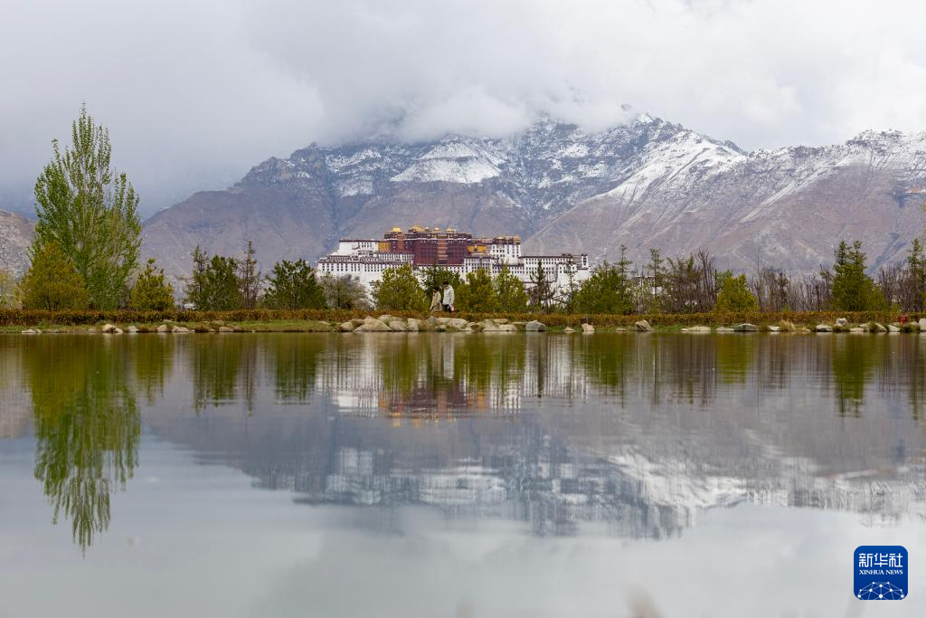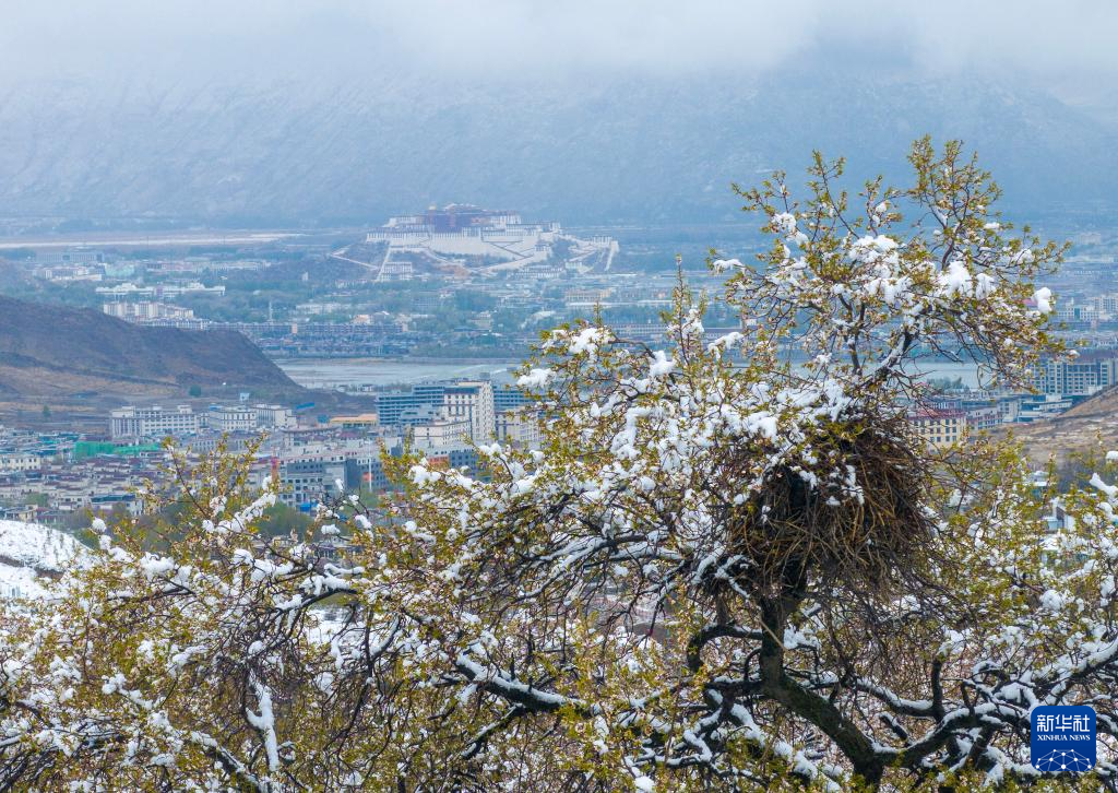 4月14日晚间,拉萨城区降下春雪,白雪与满城的新绿相映成趣。