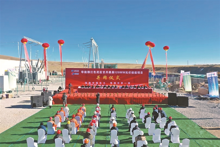 华能雅江色尼区甘丹康桑120MW光伏储能项目并网仪式现场(资料图片)。