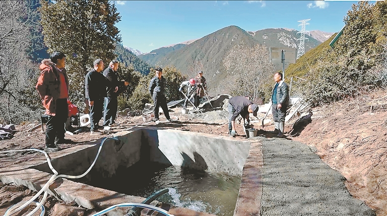 则巴乡达曲村干部与群众一起清理水池。记者 平措郎加 摄
