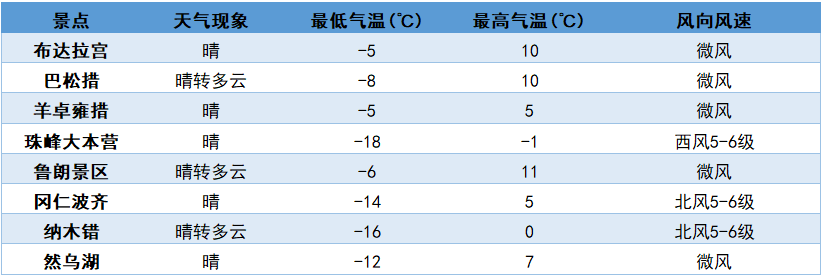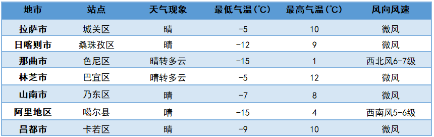 72小时趋势预报:全区晴天间少云。阿里、那曲、昌都北部、山南南部、日喀则南部和西部高海拔地区有6至7级大风。