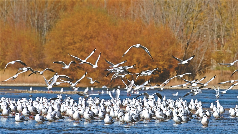 图为拉萨河畔嬉戏的候鸟。本网记者 唐斌 摄