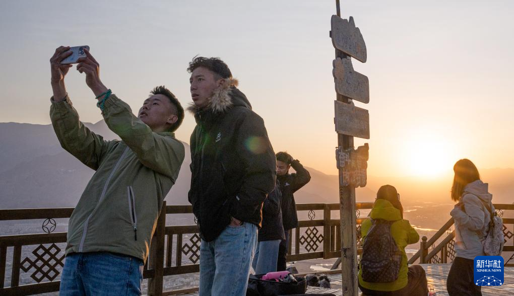 4月26日日出时分,游客在拉萨市南山公园拍照。新华社记者 丁增尼达 摄