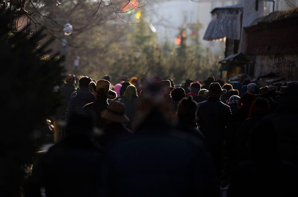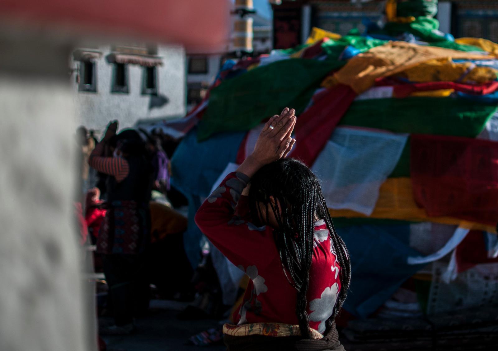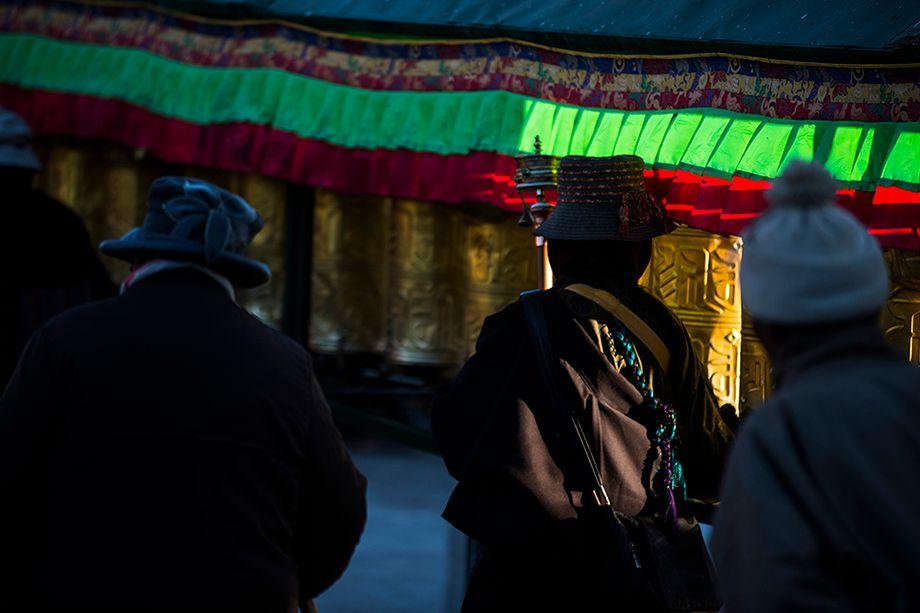 圣殿前,庙宇间,太阳每每露出其光芒四射的容颜,如同佛法般照耀着大地,温暖着人们的内心,更普照着信众的灵魂。伴着雪域高原朝阳光影间温暖的瞬间,常见磕拜长头者。他们以此表达对佛祖的敬礼。