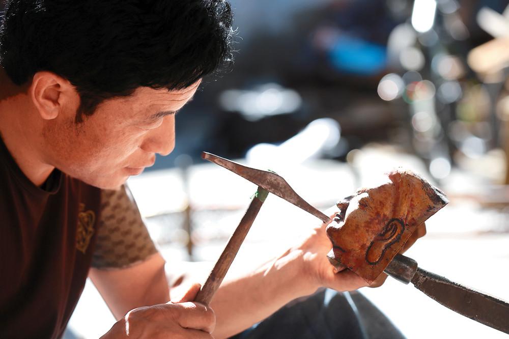 在朵普·次嘎家的藏式茶几上,一束金属锻铸造的花与寻常人家的装饰与众不同。三朵铜花插在一个铜制的花瓶里,一颗花骨朵,含苞待放微微低头;一朵渐次开放,以婀娜的姿态向上舒展;一朵层层绽放,丝丝花蕊栩栩如生。一圈银质的花纹绕在瓶颈处,一对遨游的龙和一对嬉戏的鹿雕刻在瓶身,无论是大处还是细节都能看出锻铸造者成熟的技艺和对艺术之美的极致追求。
