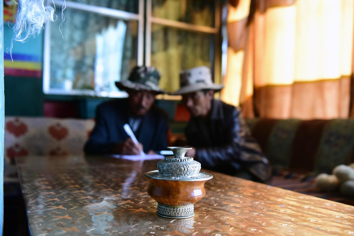 格桑和边久都是西藏自治区级非文化遗产项目“拉玉谐钦”代表性传承人,在这个生活了大半辈子的村子里,他俩承担着传承这一优秀民族文化的重任。闲暇时刻,格桑和索朗总是来到他们的练舞场,在田野间,引吭高歌,探讨心得。