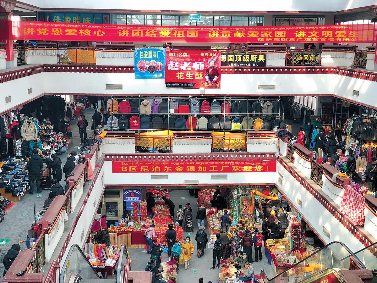 春节和藏历新年日益临近,拉萨的大街小巷,人头攒动,挑着各色年货游走叫卖的商贩穿梭其间,好不热闹;街头的彩旗、大红灯笼,让新年的氛围更加浓厚。现在,最热闹的年货市场得数八廓商城:切玛盒、“罗萨美朵”“卡赛”、酥油花及灯笼、春联等琳琅满目的年货令人眼花缭乱。