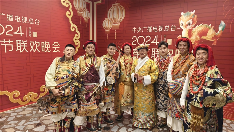 图为国家一级演奏员次旦(右四)在中央广播电视总台2024春晚后台与其他表演者合影。