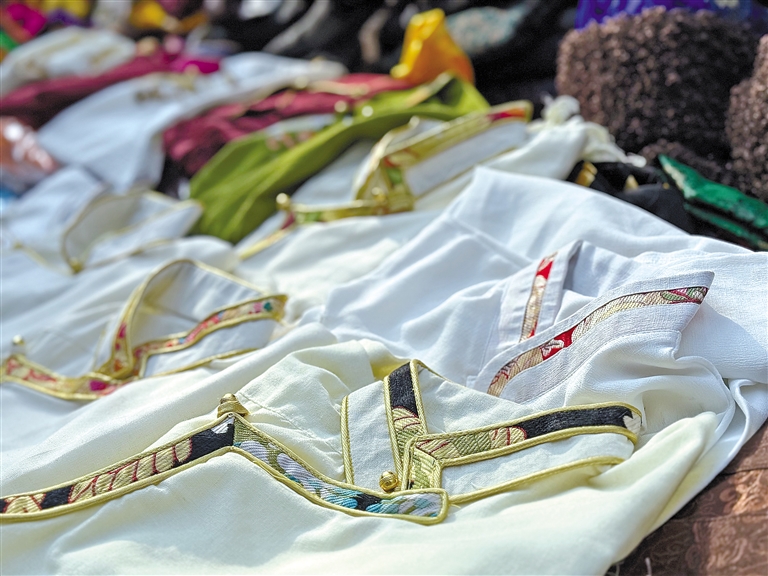“这是新款‘香布’,我们全是手工制作的氆氇,褶子越多越好看,您看新款的颜色更加艳丽喜庆。”商户旦增罗布热情介绍着自家的“香布”新品。