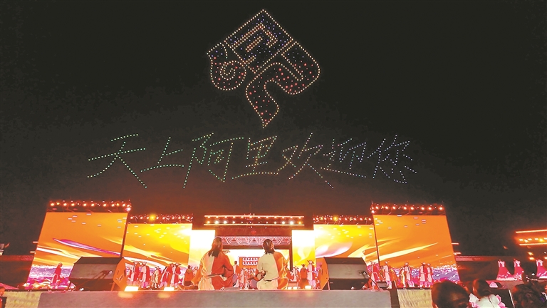 当最后一个音符落下,上千架无人机腾空而起,在墨色夜空幻化出古格王国、冈仁波齐、普兰飞天服等阿里文化符号,科技与艺术的完美融合,引得现场观众阵阵欢呼,掌声与惊叹声久久回荡。
