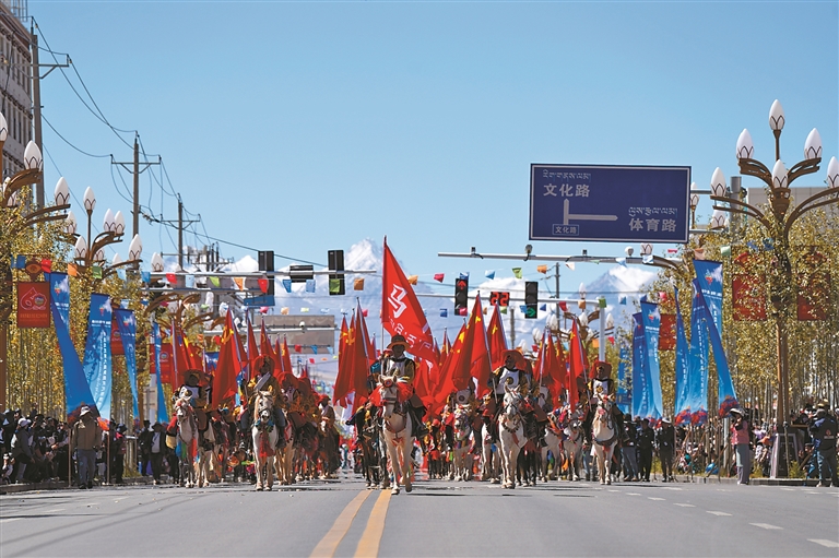 群众巡游活动接力上演,将节庆的热闹氛围推向新高潮。15支巡游方队从建设大街出发,一路绵延至狮泉河体育场,各族群众身着节日盛装,手持彩绸、花束,伴随着欢快的音乐翩翩起舞,勾勒出一幅民族团结、其乐融融的生动图景。