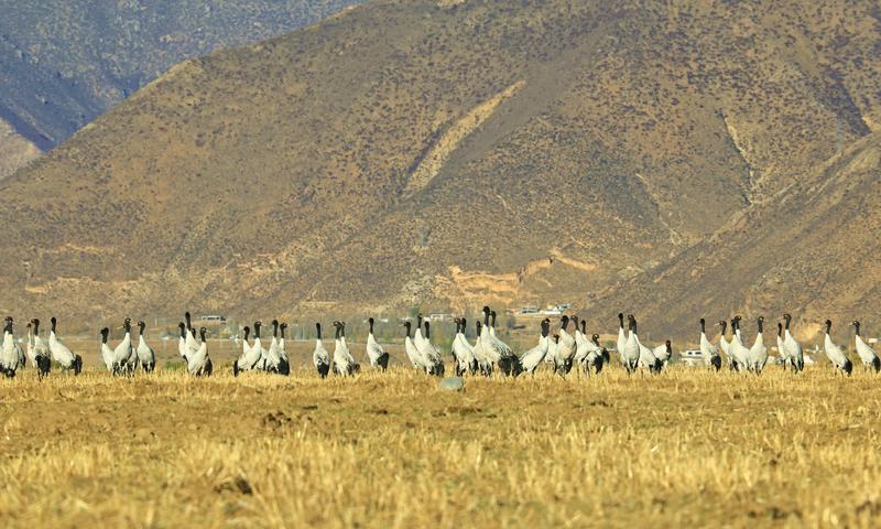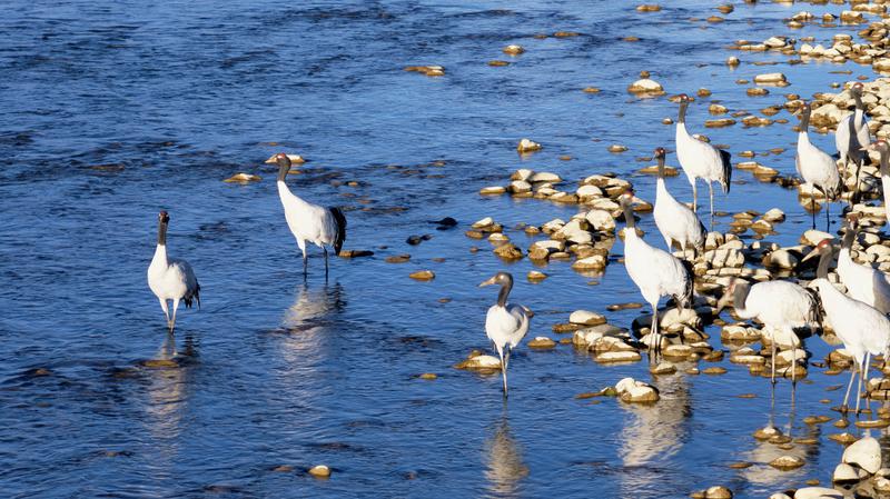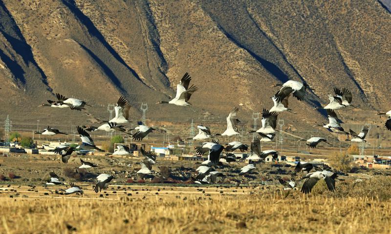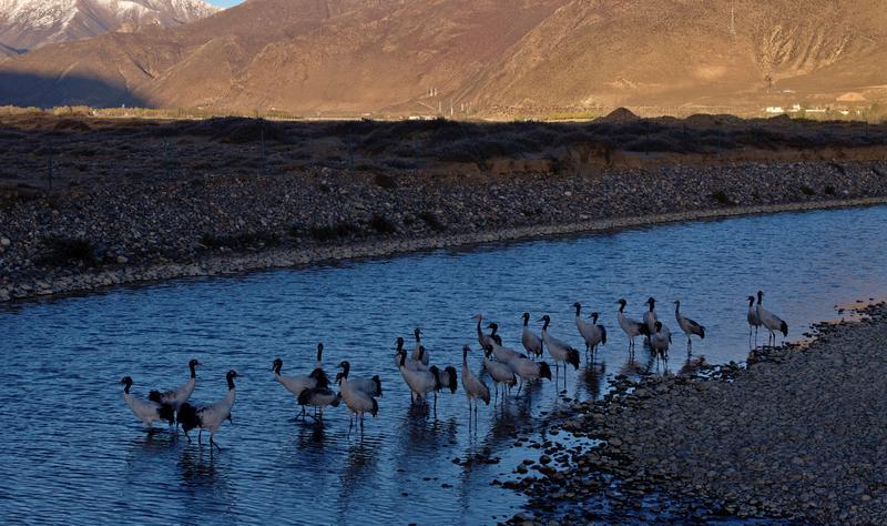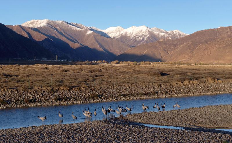 初冬的墨竹工卡县唐加乡,收割后的青稞田铺展成金色地毯,拉萨河畔的浅滩在晨光中泛着银波。几十只黑颈鹤如约而至,它们或低头啄食田间的残茬,或展翅掠过河面,身姿优雅如诗。这群高原的“白色信使”已在此安营扎寨,拉萨河因水位下降形成的湿地成为它们的“天然餐厅”,而农田则提供了温暖的“避风港”。黑颈鹤的翩跹身影,为雪域高原的寒冬添了一抹灵动的生机。