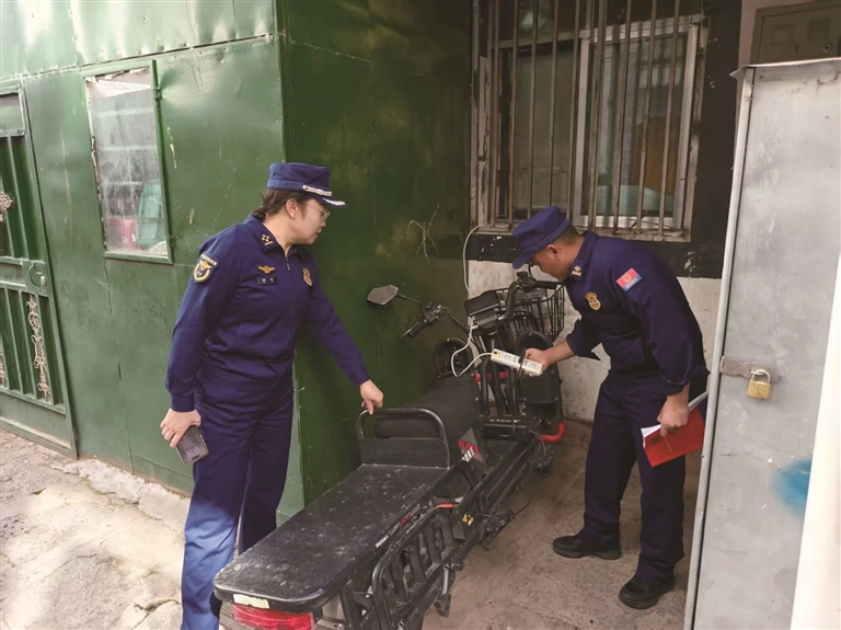 图为消防员排查电动自行车飞线充电安全隐患。(图由拉萨消防救援支队提供)
