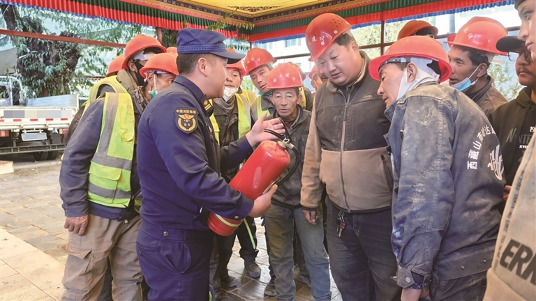 图为消防员正在为农民工普及消防安全知识。(图由拉萨市消防救援支队提供)