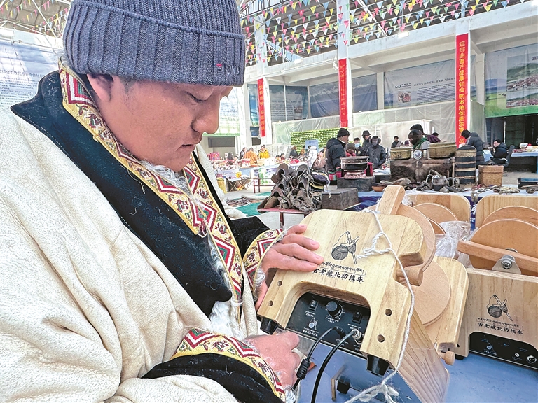 展销商正在展示自己的新发明“古老藏北纺线车”。 本网记者 万靖 摄