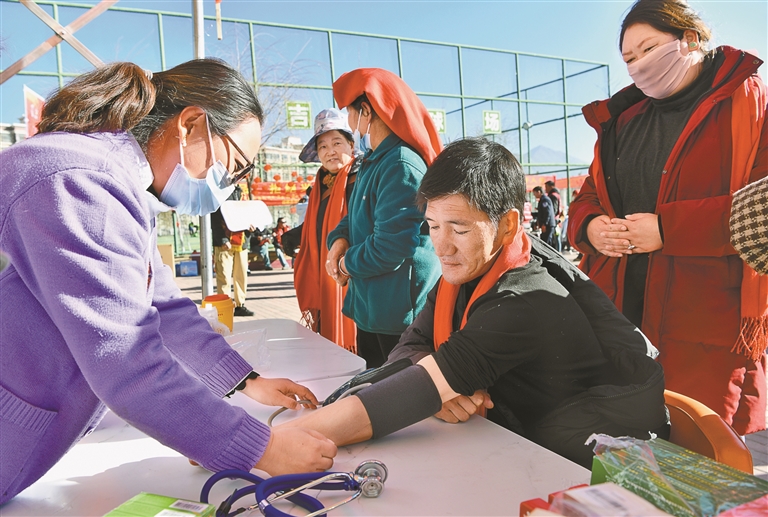 图为在健康安全宣传服务区,工作人员为群众免费量血压。记者 王敏 摄