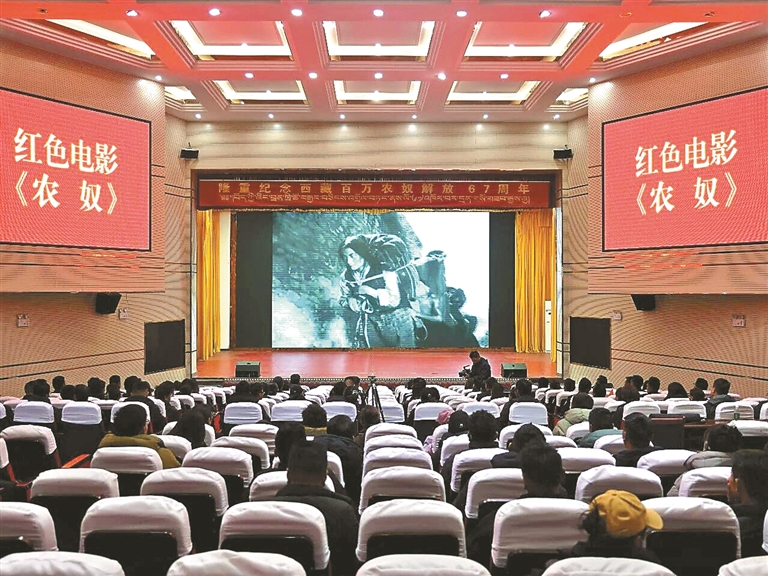 浪卡子县组织播放红色电影《农奴》,激励广大干部群众听党话感党恩跟党走。记者 武沛涛 摄