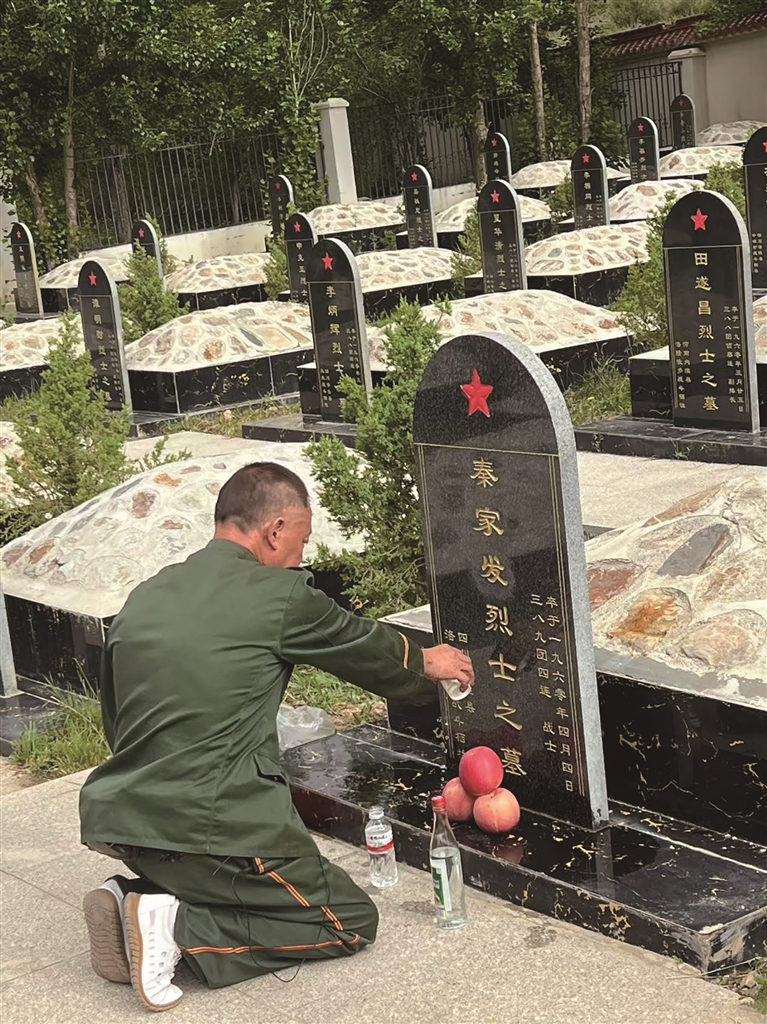 在重庆涪陵籍烈士夏华清的墓碑前,侄子夏木忠将从夏华清出生的老屋院子里取来的土撒在墓碑周围。随后,他掏出夏华清母亲的照片放在墓碑前,让这位思念儿子的母亲与儿子“相伴”。