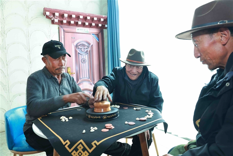 图为墨竹工卡县尼玛江热乡羊日岗村农村幸福苑里,老人在玩藏式骰子。记者 格桑伦珠 摄