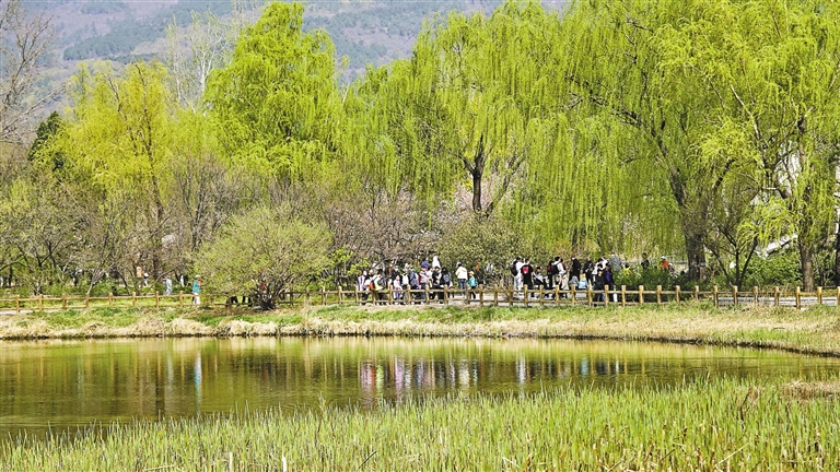 4月4日,游客在北京国家植物园内踏青。新华社记者 李欣 摄