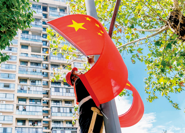 随着国庆节临近,节日氛围日益浓郁。金华市区主要道路两旁的路灯杆,工作人员正进行国旗悬挂,每一面国旗都按照规范要求悬挂,整齐划一。市区商业中心各大商场也纷纷加入到国庆氛围营造的行列中。此次全方位营造国庆氛围,不仅展示了金华市的城市活力与魅力,更激发了市民的爱国热情。(韩东儒)