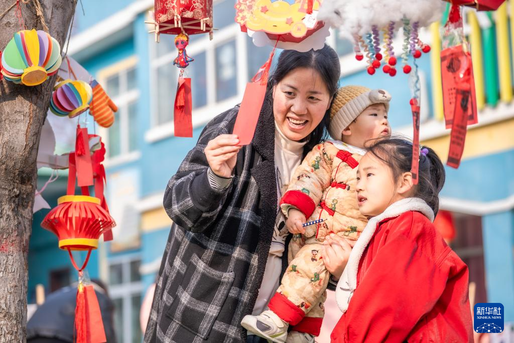 12月30日,在河南省驻马店市西平县一所幼儿园的元旦亲子游园庙会上,小朋友和家人一同参与猜灯谜游戏。新华社发(赵永涛 摄)