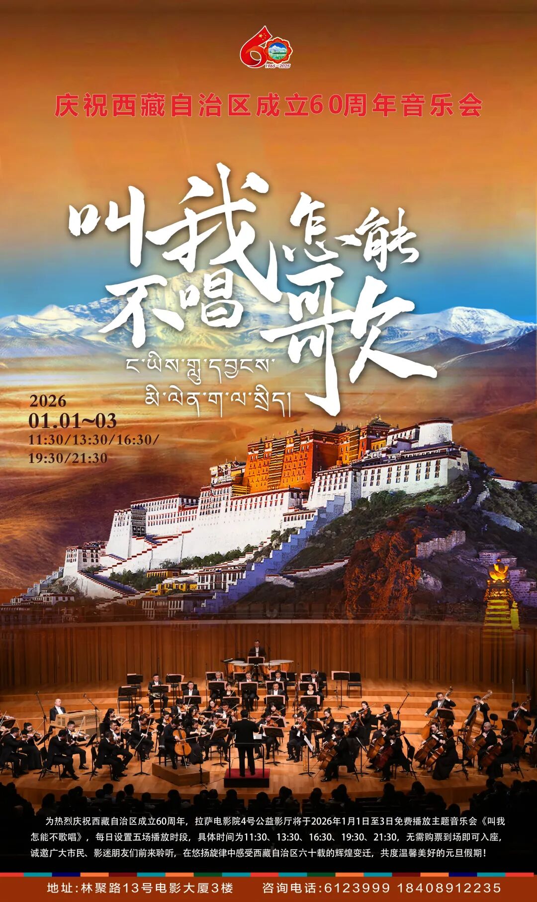 庆祝西藏自治区成立60周年音乐会《叫我怎能不歌唱》将于2026年1月1日至3日在拉萨电影院4号公益影厅免费播放。