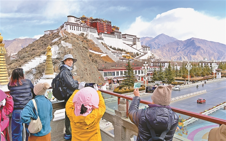 游客与布达拉宫合影。记者 王敏 唐斌 摄