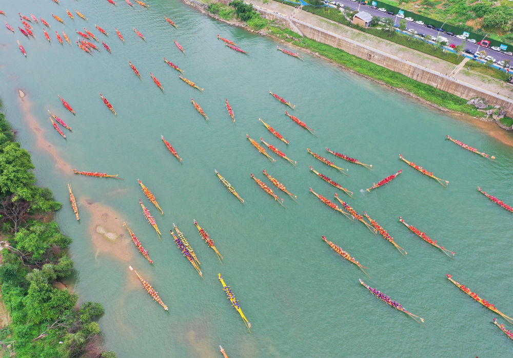 6月17日,多条龙舟在湖南省永州市道县举行的龙舟赛上竞渡(无人机照片)。新华社发(何红福摄)