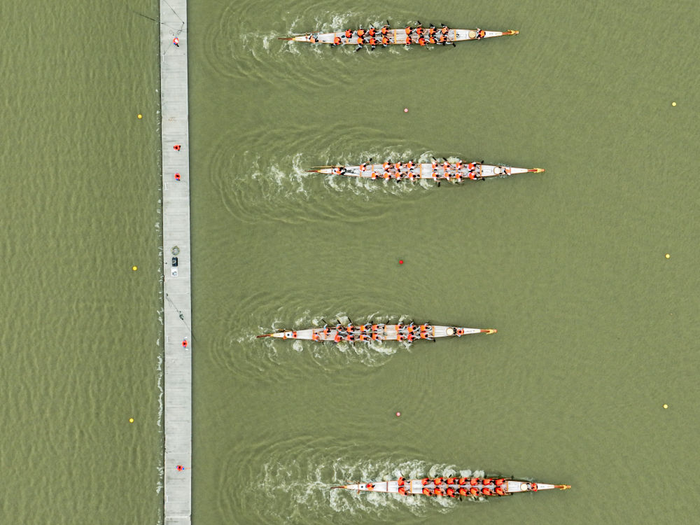 6月17日,在江苏省宿迁市泗洪县临淮镇水上运动中心,人们参加龙舟竞渡比赛(无人机照片)。新华社发(许昌亮摄)