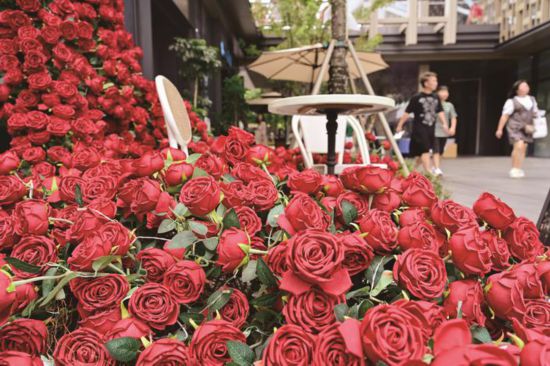 8月14日,为了迎接七夕,嘉兴南湖天地进行了专门的布置,玫瑰花墙、爱心墙、爱心红绿灯、爱心气球……浪漫气息随处可见。商家们将专门为七夕准备的礼盒和套装摆放在显眼位置,抢抓浪漫经济。(张启帆)