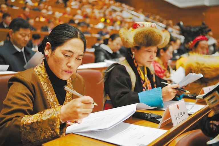 1月4日上午,自治区十一届人大五次会议在拉萨隆重开幕。图为人大代表在认真聆听政府工作报告。记者 王敏 摄