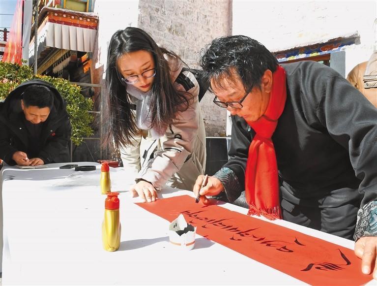 1月26日下午,拉萨市城关区八廓街夏扎大院内张灯结彩、喜气洋洋,拉萨市暨城关区新时代文明实践活动之“我们的节日,春节藏历新年”主题活动在这里举行。西藏自治区书法家协会的书法家们来到现场,笔蘸浓墨、心怀祝福,为群众写春联、送“福”字。 图为书法家为群众写春联。 记者 旦增兰泽 摄
