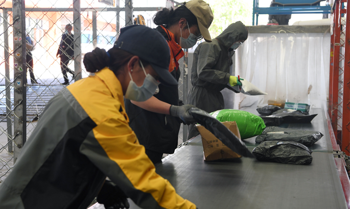 图为拉萨市某快递公司快递员正在对快递包裹进行分拣。记者 唐斌 洛桑 摄