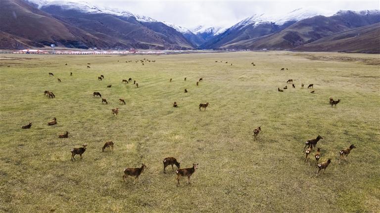5月21日在类乌齐马鹿国家级自然保护区拍摄的马鹿(无人机照片)。新华社记者 周荻潇 摄