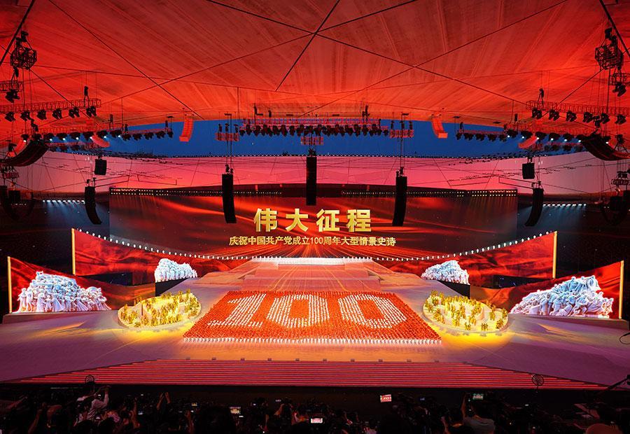 2021年6月28日晚,庆祝中国共产党成立100周年文艺演出《伟大征程》在北京国家体育场盛大举行。这是盛典仪式。