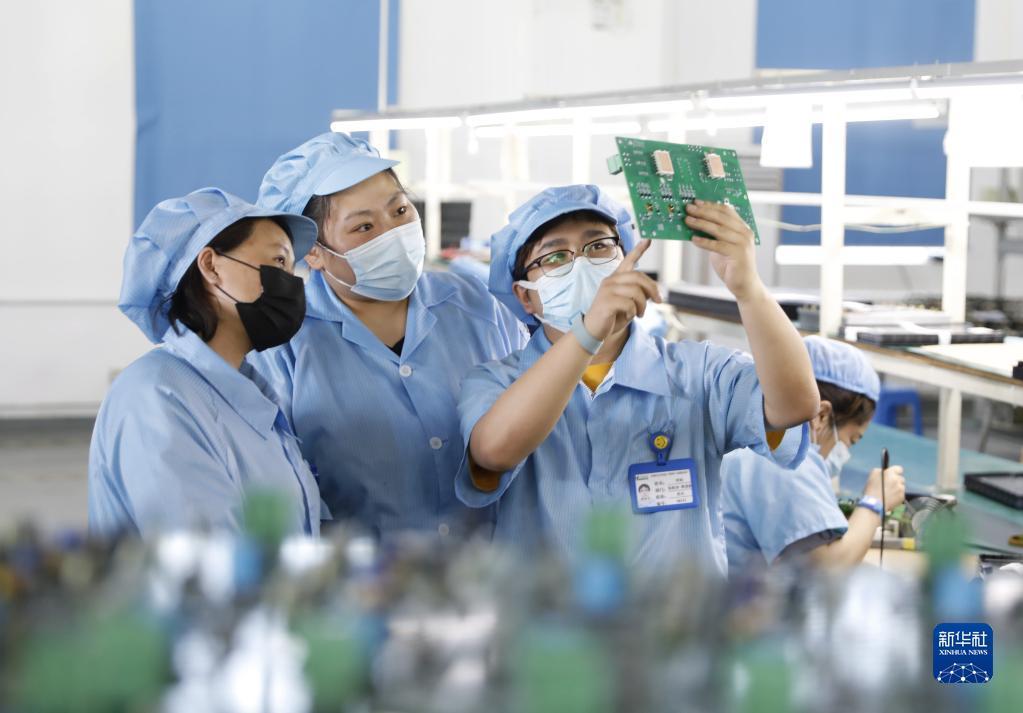 6月3日,在河北省固安县工业园一家电子科技企业生产车间,质检人员对电子零配件进行检查。新华社记者 骆学峰 摄