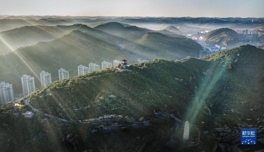 这是2019年8月29日拍摄的被绿色环绕的陕西省延安市宝塔山(无人机照片)。 新华社记者陶明摄