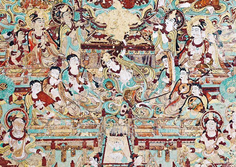 敦煌文化延续近两千年,是世界现存规模最大、延续时间最长、内容最丰富、保存最完整的艺术宝库,是世界文明长河中的一颗璀璨明珠,也是研究我国古代各民族政治、经济、军事、文化、艺术的珍贵史料。图为莫高窟第112窟南壁壁画“反弹琵琶乐舞图”。 敦煌研究院供图