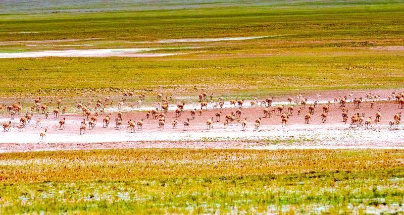 近年来,随着生态环境保护力度加强,西藏境内一些高原特有珍稀野生动物种群数量得到明显恢复,藏羚羊由5万只增加到约30万只,保护级别已经从濒危物种降为近危物种。这是在羌塘国家级自然保护区内拍摄的藏羚羊(7月11日摄)。新华社记者 周荻潇 摄