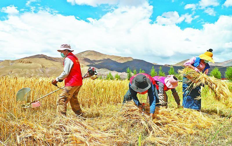 图为错那县觉拉乡新时代文明实践志愿者帮助被隔离群众收割青稞。向秋仁青 记者 刘枫 摄