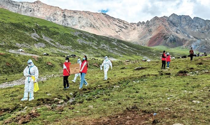 疫情发生以来,昌都市江达县迅速行动,开展全员核酸检测工作。因夏季牧场交通不便,通讯信号弱,由江达镇志愿者及江达县人民医院医护人员组成的核酸检测采样小组,徒步前往敏达村夏季牧场,为当地牧民进行核酸检测采样。图为江达县核酸检测采样小组前往牧场途中,确保核酸检测不落一户、不漏一人。陈皎巴特 记者 万慧 摄