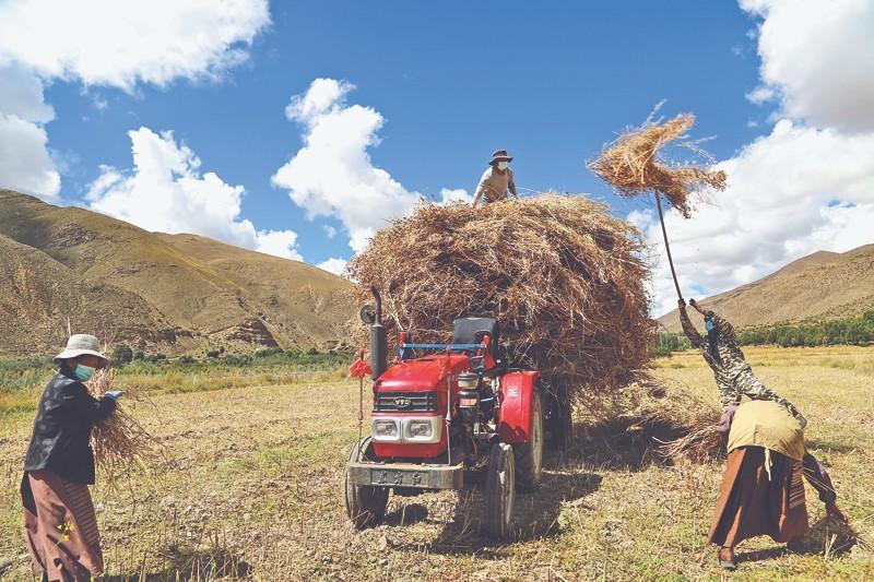 春种一粒粟,秋收万颗子。今年的秋收季,面对考验,我区各地在从严从实做好疫情防控的同时,引导农牧民群众错时错峰进行秋收,确保群众的农业收入不因疫情受损。图为山南市琼结县加麻乡扎西村村民在将油菜装车。记者 次旺 通讯员 伦珠泽仁 摄