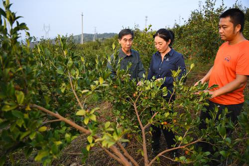 9月21日,在广东韶关乐昌市梅花镇梅花村,白拉曲珍(中)和师傅江建发(左)、同事伍国清在石漠化综合治理的油茶种植基地查看油茶生长情况。
