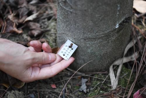 9月21日,在广东韶关乐昌市秀水镇大罗岭村,白拉曲珍在石漠化生态恢复监测平台固定样地查看树木标牌。