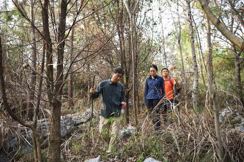 9月21日,在广东韶关乐昌市秀水镇大罗岭村,白拉曲珍(中)和师傅江建发(前)、同事伍国清在石漠化生态恢复监测平台固定样地工作。