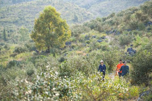9月21日,在广东韶关乐昌市梅花镇流山村,白拉曲珍(左)和师傅江建发(右)、同事伍国清来到石漠化综合治理的油茶种植基地查看油茶生长情况。