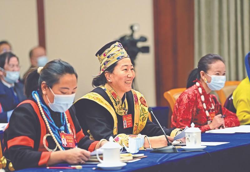 10月17日,西藏代表团举行分组会议,认真讨论党的二十大报告。 图为西洛卓玛代表(中)在会上发言。 记者 旦增西旦 摄